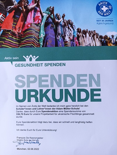Unter diesem Motto veranstalteten alle Klassenstufen in der Woche vom 9. bis 13. Mai 2022 einen Spendenlauf. Sie zeigten sich dabei solidarisch mit den ukrainischen Kriegsopfern. Der Spendenlauf vermittelte den Kindern und Jugendlichen Spaß an Bewegung und steigerte die Motivation „laufend“ zu helfen.