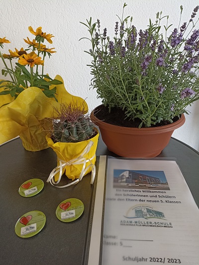 Mit dem kleinen Blumengarten, den Frau Mayer auf dem Schulhof aufgebaut hatte, ließ sich die Vielfalt der neuen Schülerinnen und Schüler gut vergleichen. Sonnenhut, Lavendel, Kakteen und fleißige Lieschen, beschrieben die Persönlichkeiten der Kinder. Als Erinnerung an die Begrüßung durften sich alle Fünftklässler Blumensamen zur Aussaat in den Ferien mit nachhause nehmen.